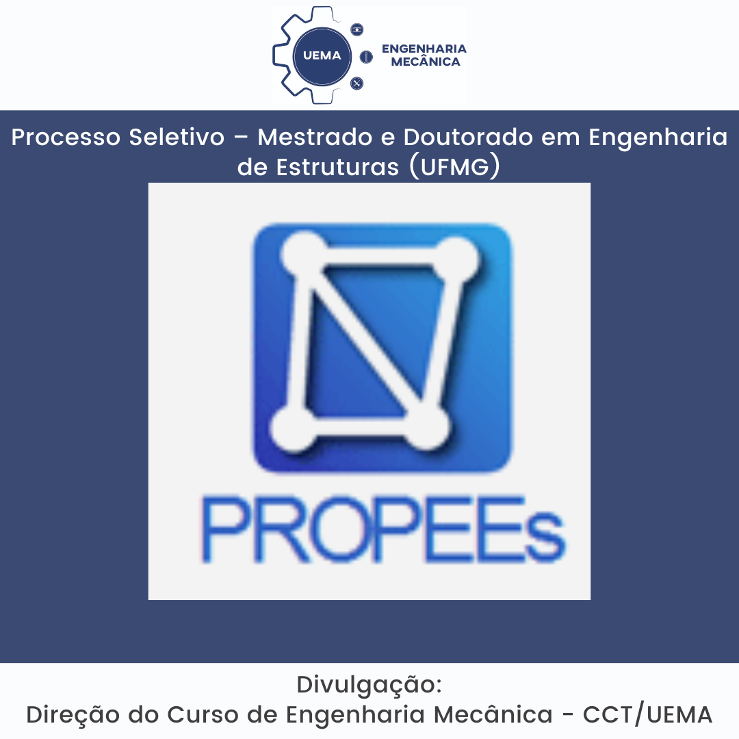 O Programa de Pós-graduação em Engenharia de Estruturas da UFMG (PROPEEs) informa que estão abertas as inscrições para o processo seletivo dos cursos de Mestrado e Doutorado, no período de 13 de outubro a 21 de novembro de 2025, conforme os editais disponíveis no site do Programa.